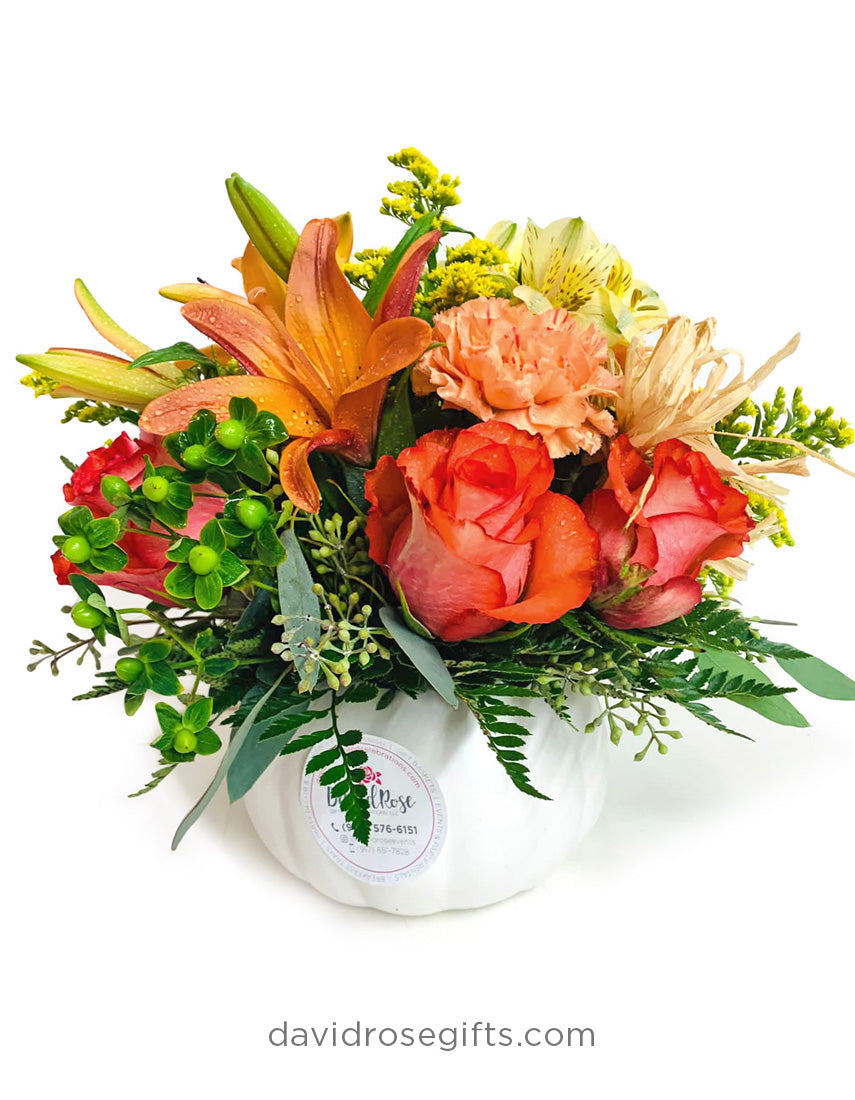 This flower arrangement contains: Orange lillies, carnations, red roses, astromelias, hiperycum, leather leaf, eucalyptus, solidago.