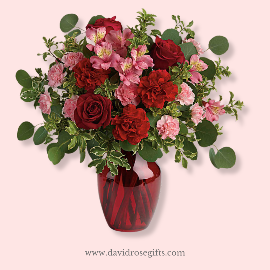 This beauty with red roses with pink alstroemeria and some greens in a vibrant red vase for a gorgeous gift, that special person never gonna forget!
