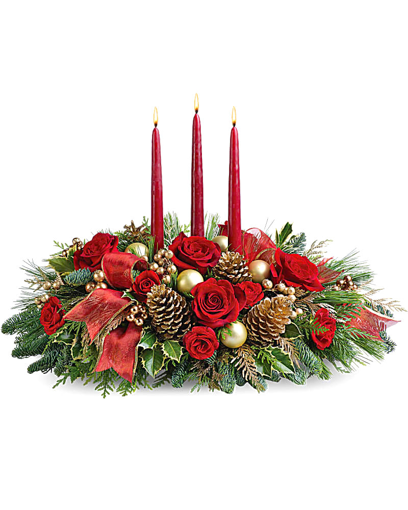 Gather family and friends together for a holiday meal around this traditional Christmas centerpiece featuring pinecones, holly, noble fir and Christmas candles. 'Tis the season to shine!