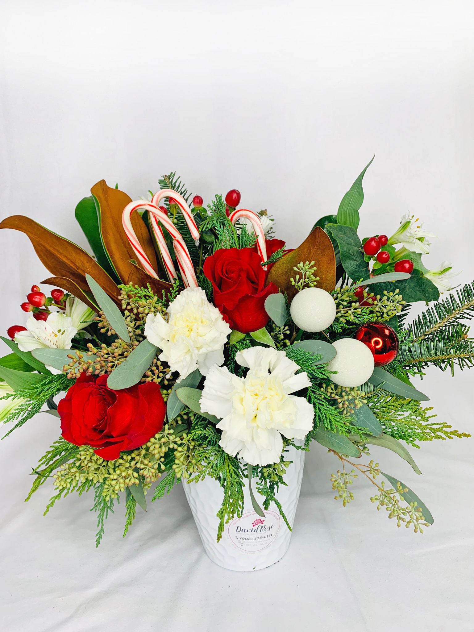 This festive bouquet features red roses, white carnations and alstroemeria, seeded eucalyptus and magnolia leaves. Delivered with holiday ornaments and sweet candy canes in a vase.