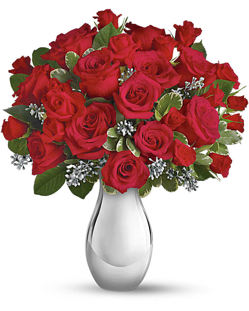 For a merrier Christmas and a happier New Year, set the scene with ravishing holiday flowers-red roses in a dazzling silver reflections vase. The gorgeous Christmas bouquet includes red roses, red spray roses accented with seeded eucalyptus and variegated pittosporum.