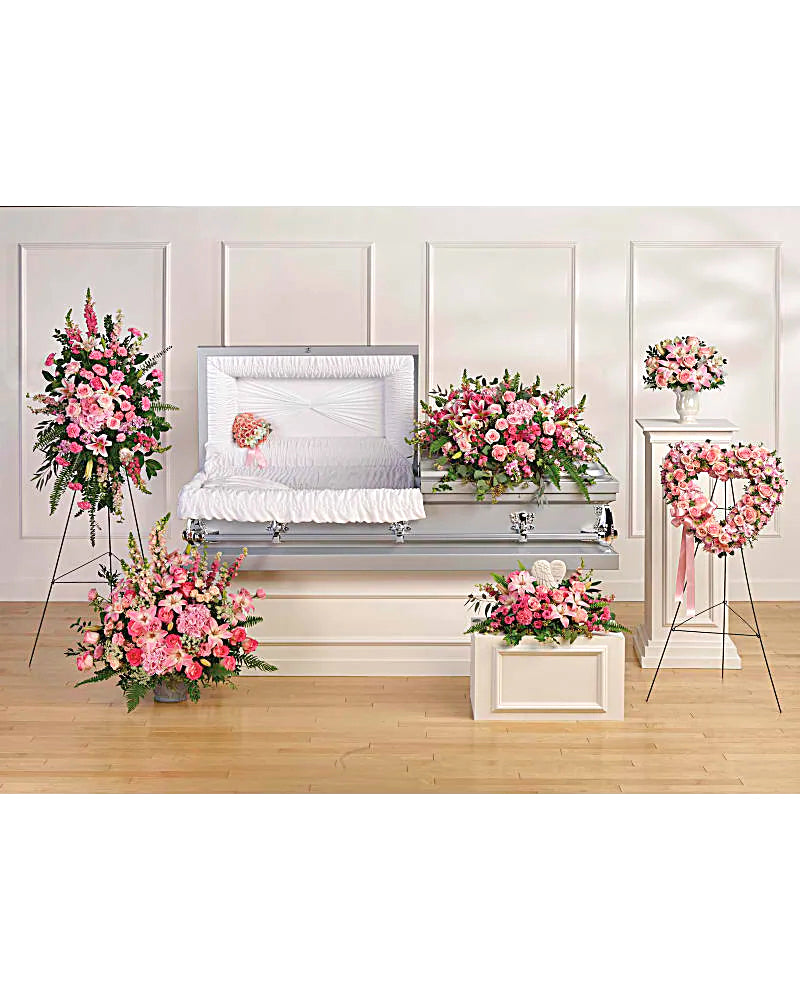 Soft and serene, this glorious collection of seven hand-made sympathy pieces celebrate your beautiful memories with the feminine grace of peaceful pink blooms.