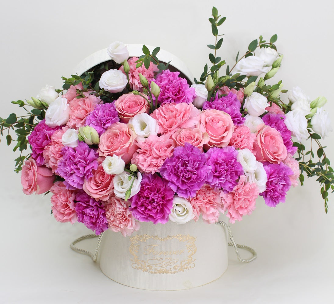 Gathering of assorted flowers as pink roses, carnations and fine lisianthus. Color box might vary depends on availability at the moment