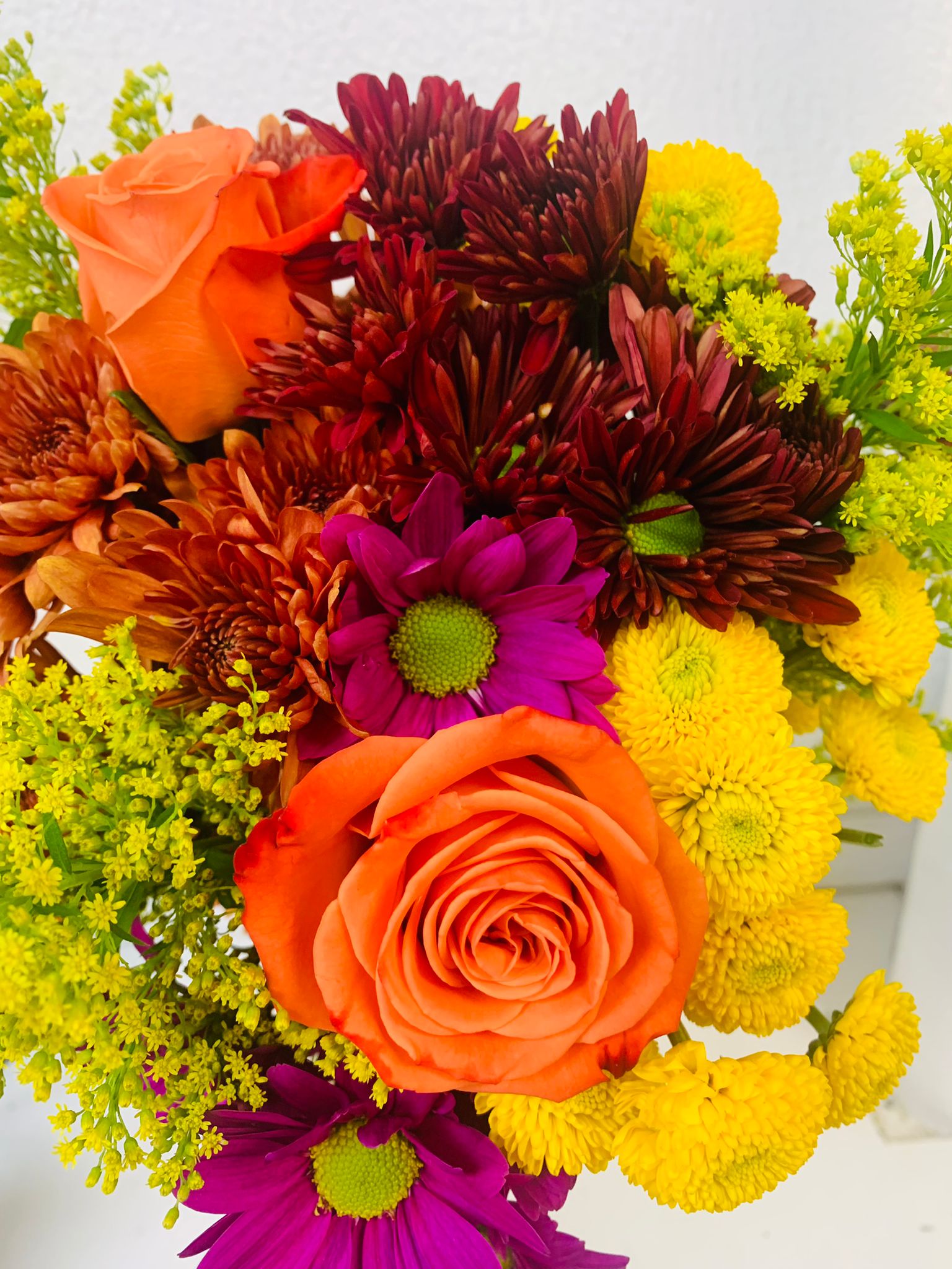 This arrangement features fresh fall seasonal flowers available in the shop. Stem count, packaging and container may vary depends of size. This is delivered in a glass vase.