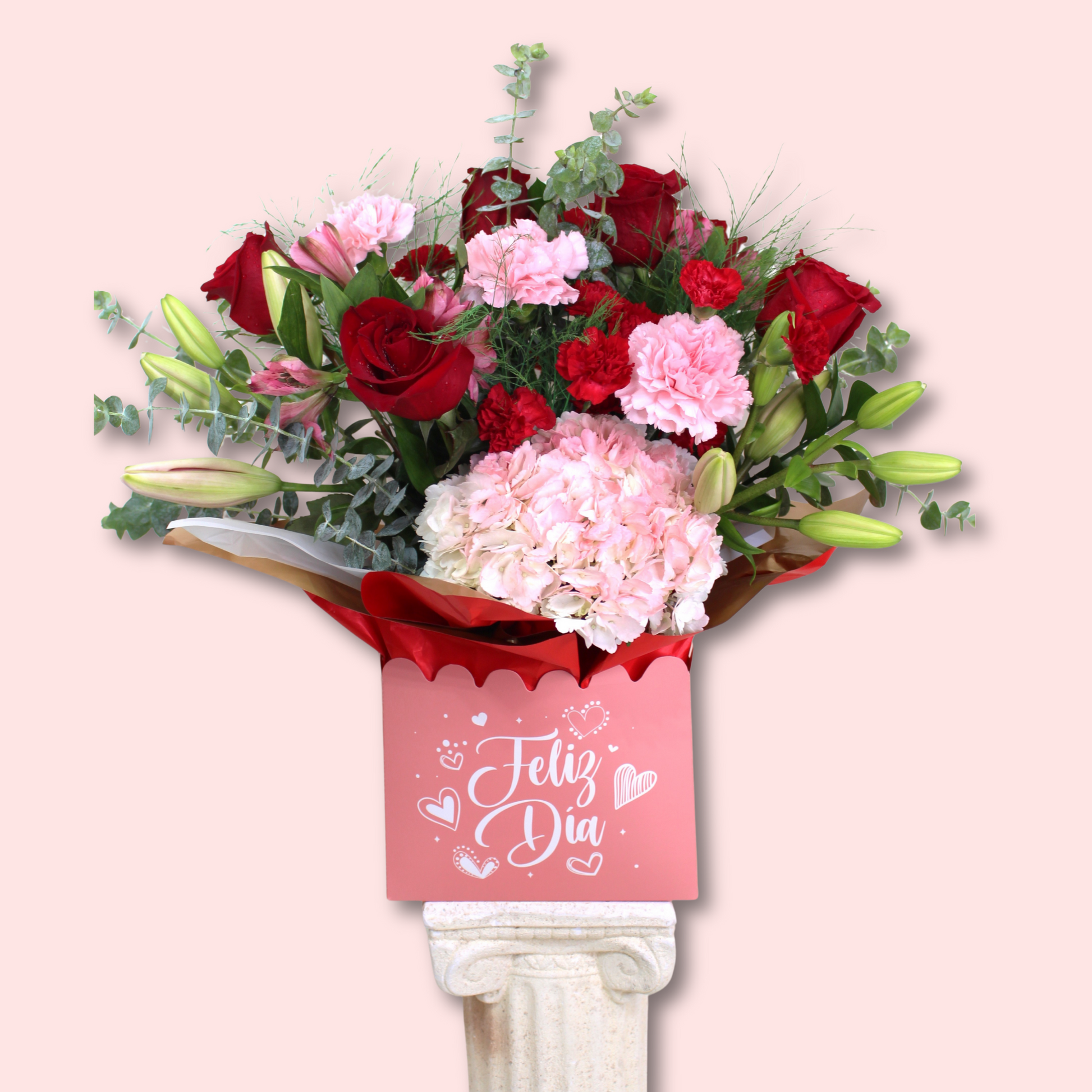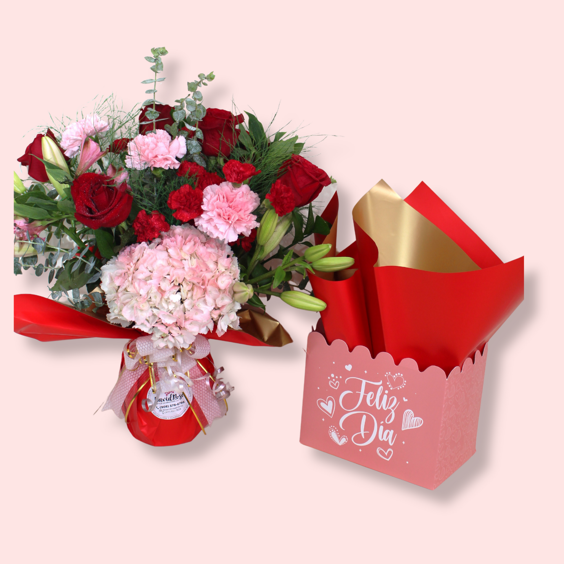 Mix Flower Arrangement in a vase. Includes box with a phrase.
