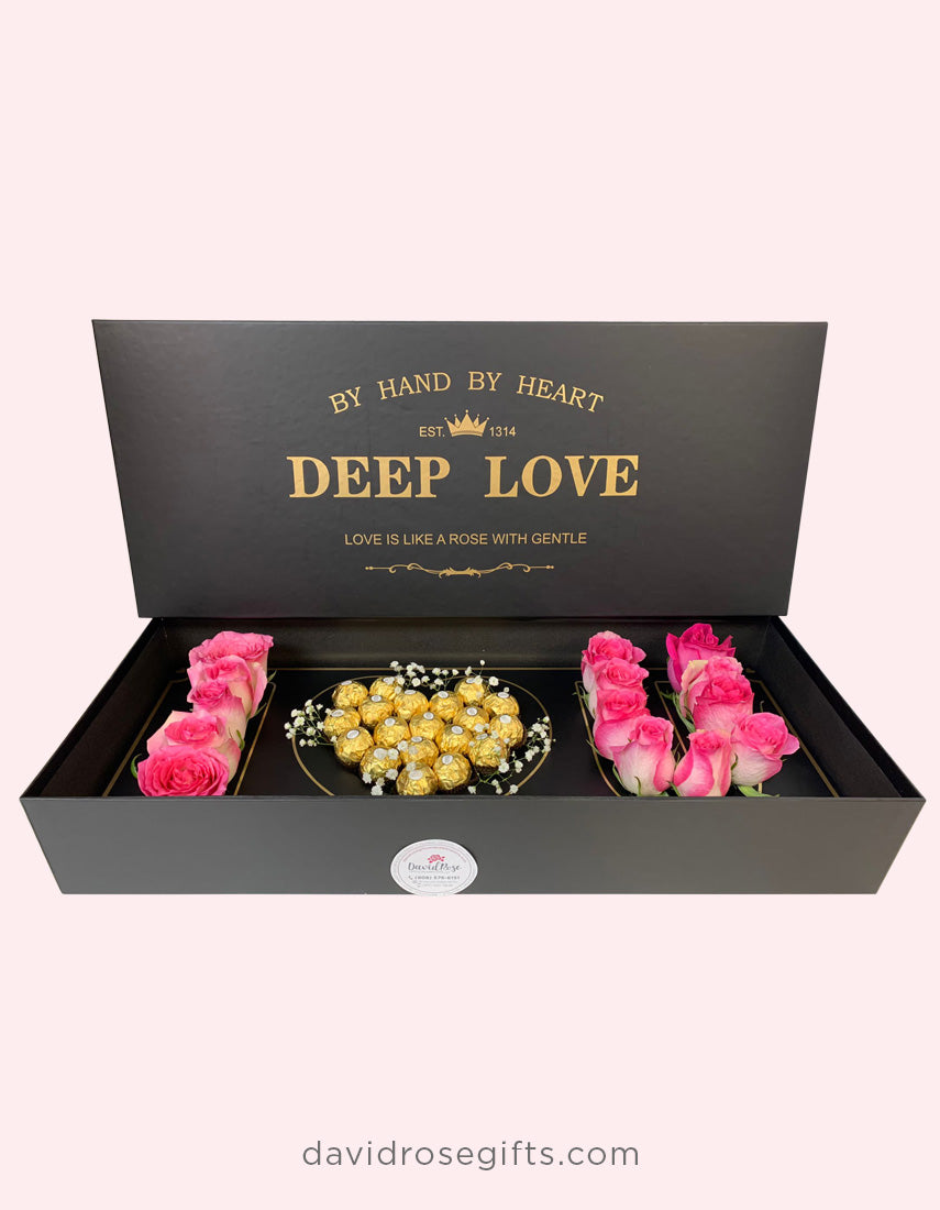 Our I Love You Box is gathered with fresh roses in any color of your preference with sweet Ferrero Rocher chocolates inside a rectangular black box.