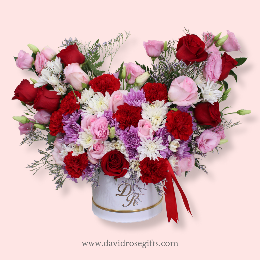 Beautiful composition of red and pink blooms inside a box. Perfect to her!