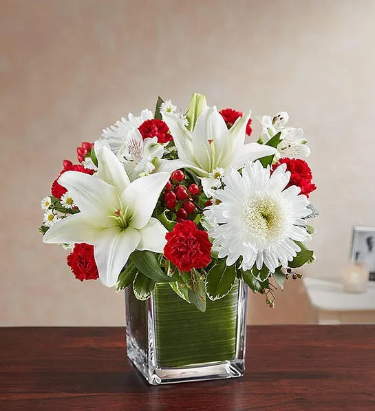 Arrangement of red roses, with assorted blooms. Delivered in a clear glass cube.